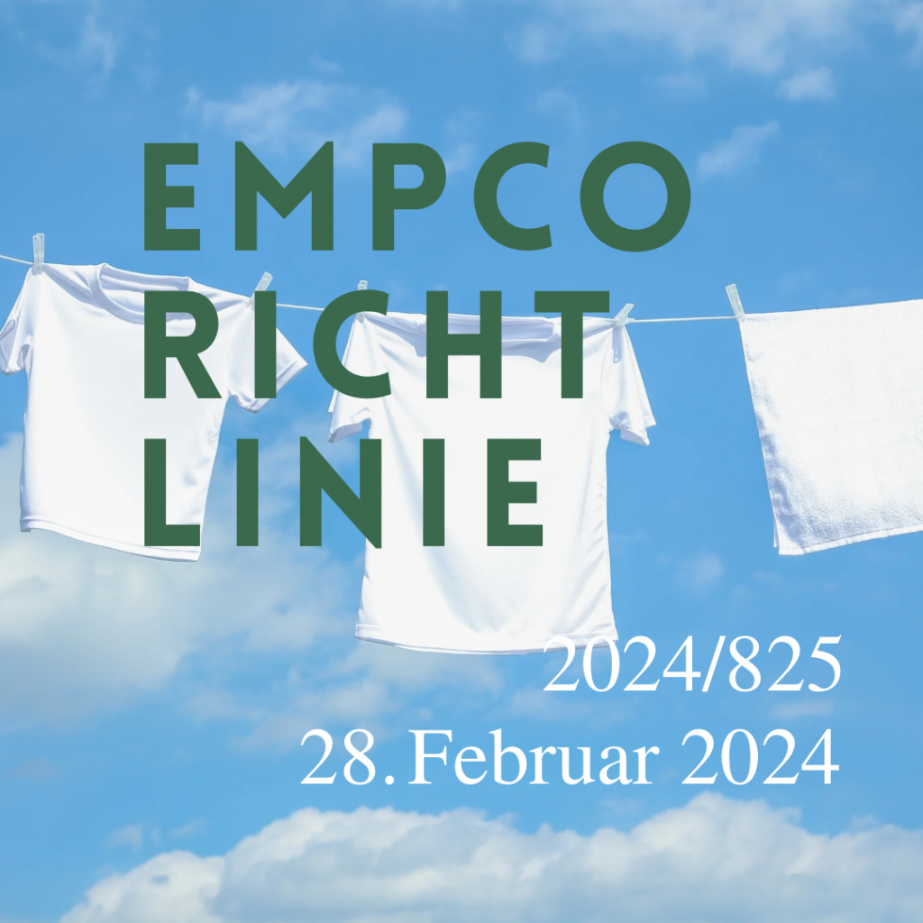 Die Richtlinie (EU) 2024/825, kurz EmpCo-Richtlinie (von Empowering Consumers for the Green Transition), ist seit dem 27. März 2024 in Kraft. Sie ändert zwei bestehende EU-Richtlinien: die Richtlinie über unlautere Geschäftspraktiken (2005/29/EG) und die Verbraucherrechterichtlinie (2011/83/EU). Ziel ist ein europaweit einheitlicher Schutz vor irreführenden Umweltaussagen – kurz: gegen Greenwashing.