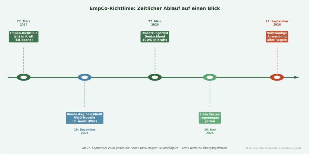 Als EU-Richtlinie entfaltet die EmpCo keine unmittelbare Wirkung gegenüber Unternehmen. Sie muss zunächst in nationales Recht umgesetzt werden. In Deutschland geschieht dies durch das Dritte Gesetz zur Änderung des Gesetzes gegen den unlauteren Wettbewerb (UWG), dem der Bundestag am 19. Dezember 2025 zugestimmt hat, verkündet am 19. Februar 2026 im Bundesgesetzblatt, in Kraft größtenteils ab dem 27. September 2026.